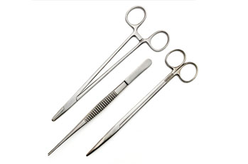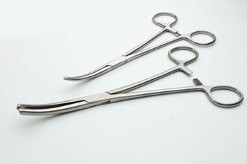 Locking Forceps, commonly called Clamps are ratcheted instruments used to hold tissue or objects or provide hemostasis. It can be traumatic or atraumatic. There are various kinds of clamps – Crile Hemostat, aka ‘snap’ are used to grasp tissue or vessels that will be tied off; Kelly Clamp is a larger size variation of hemostat with similar function; Kocher Clamp is a traumatic toothed clamp used to hold tissue that will be removed; Allis and Babcock Clamps is a slightly rounded jaws used for grasping intestines; etc.
